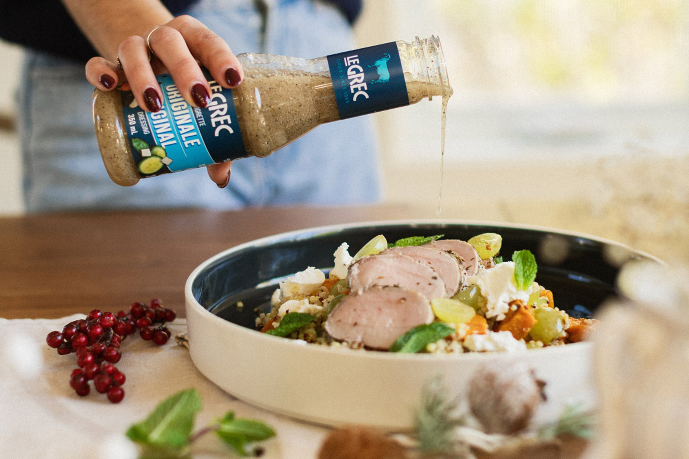 - 3.Assembly: Mix quinoa, sweet potatoes, and grapes. Add pork, drizzle with Le Grec Original salad dressing.
