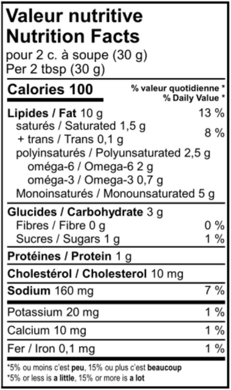 Mayonnaise (huile de canola, oeuf entier liquide, eau, jaune d\'oeuf congelé, vinaigre blanc, sel, sucre, jus de citron concentré, épices, edta de calcium disodique), crème sûre (lait, crème, lait écrémé ultrafiltré, cultures bactériennes, enzymes microbiennes), eau, vinaigre blanc, oignon déshydraté, sucre, amidon de maïs modifié, extrait de levure, sel, arôme naturel, ail en poudre, gomme xanthane, sorbate de potassium, benzoate de sodium, huile d\'oignon, épices, caramel. contient: lait, oeuf.