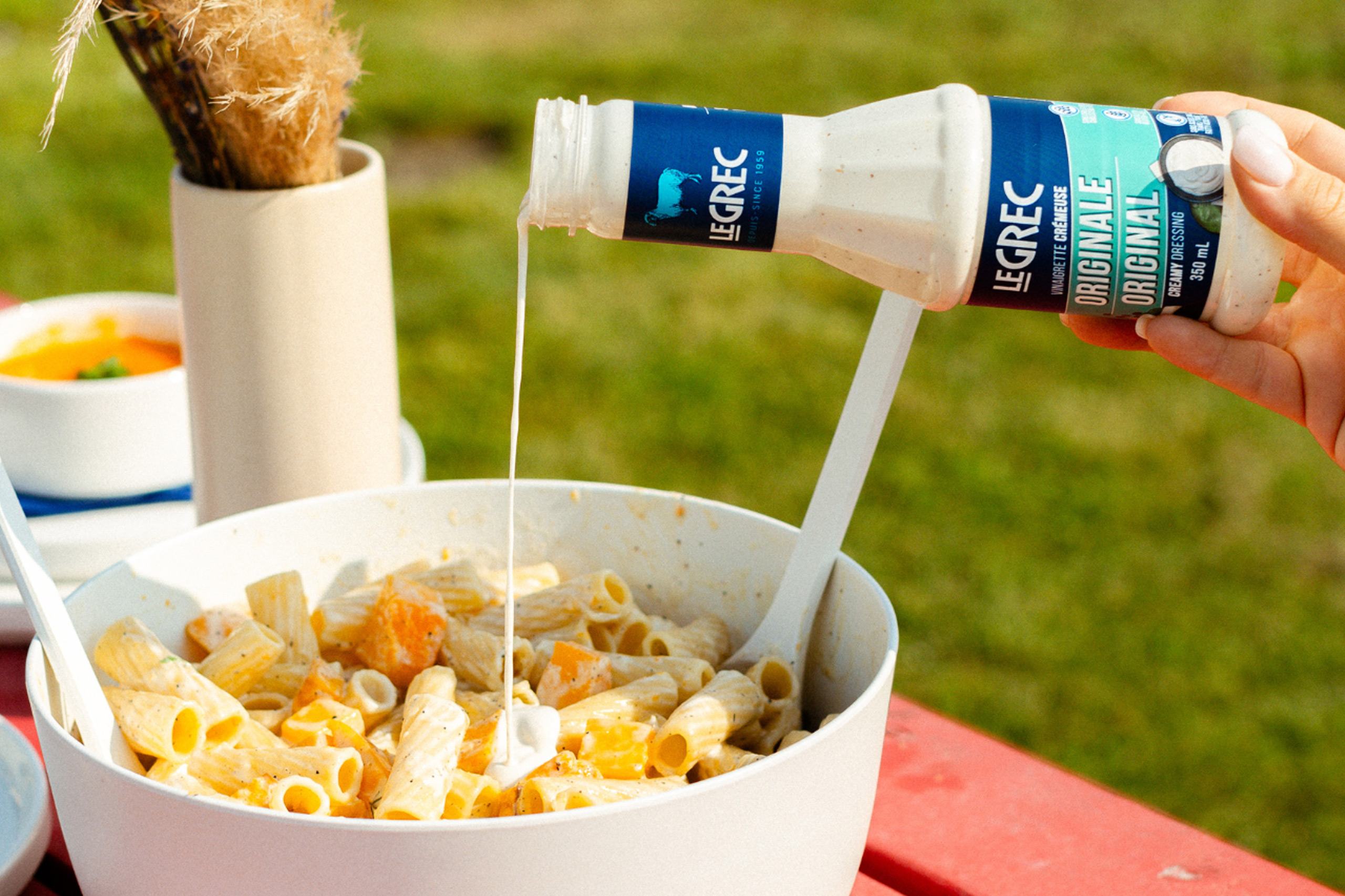 - 2. Pour une touche finale, ajouter un léger filet de vinaigrette Le Grec sur le dessus des pâtes avant de servir.